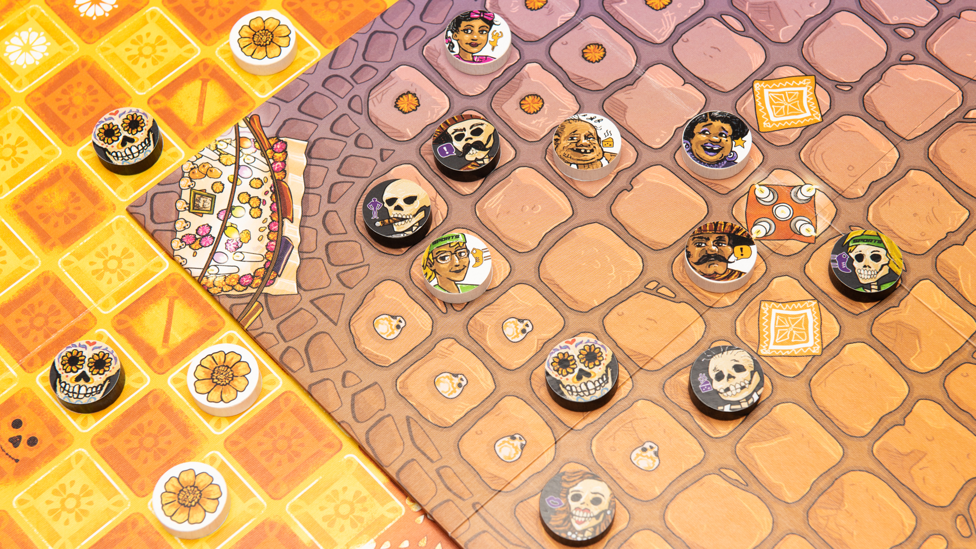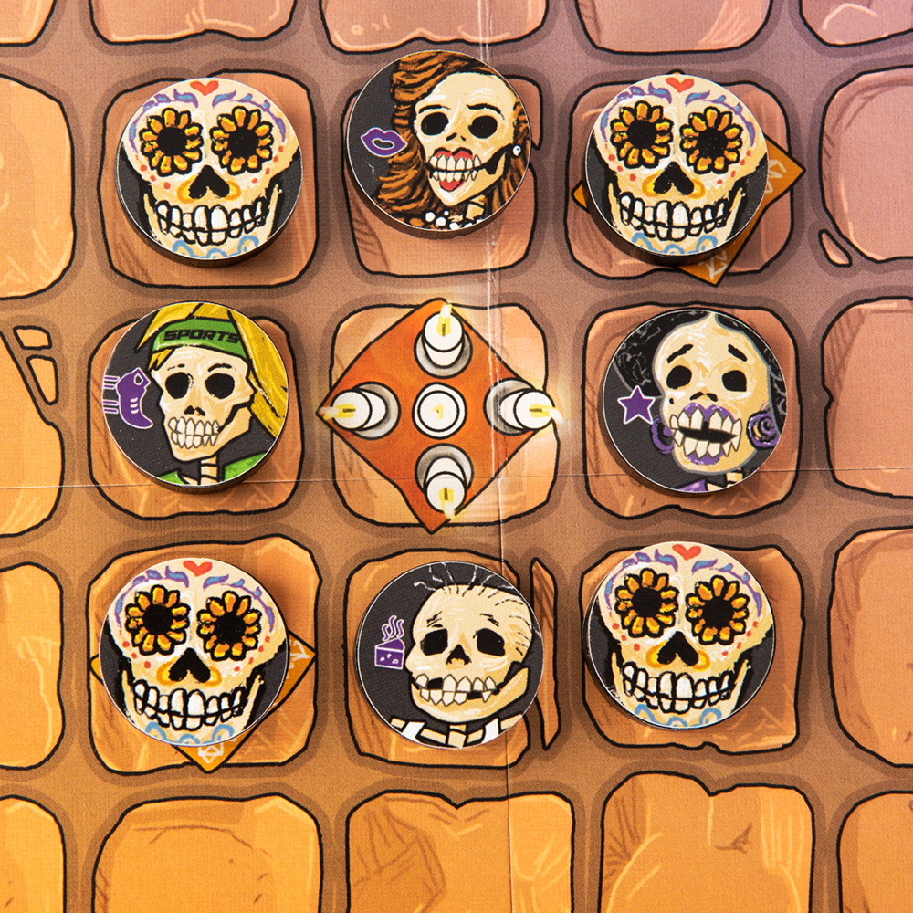 La carrera comienza… ¡Adiós Calavera! es una estratégica competición entre los vivos y los muertos para dos jugadores donde uno controla a los muertos y el otro a los vivos.