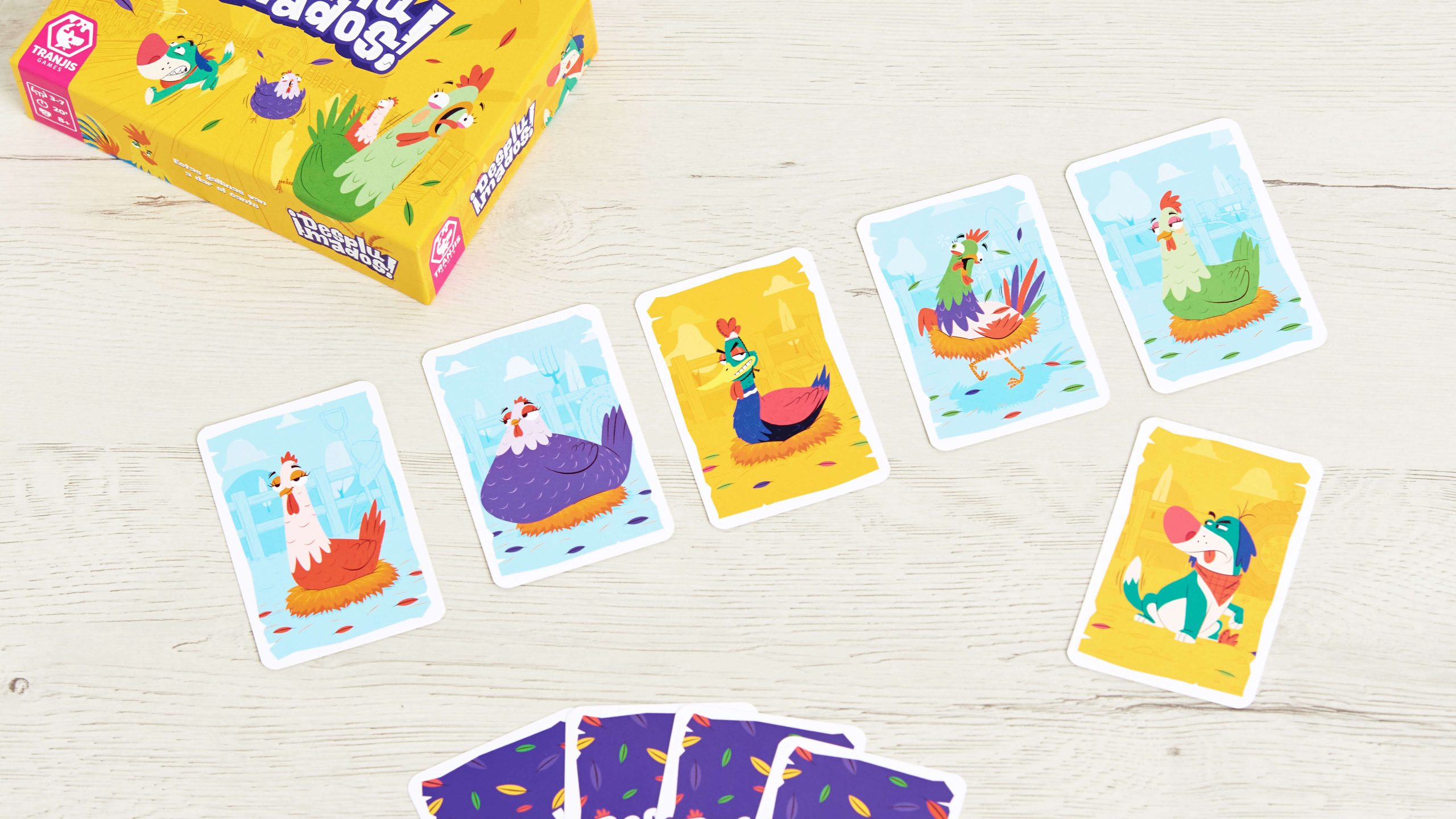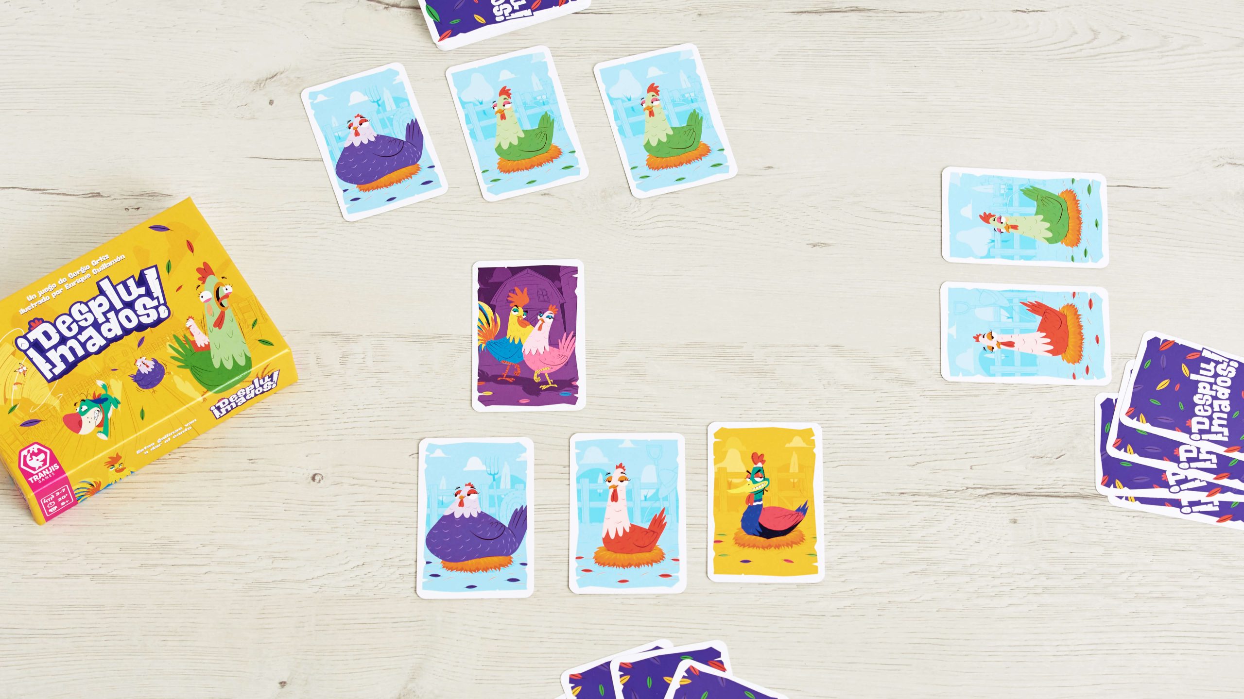 ¡Desplumados! es un juego de corte familiar, rápido, sencillo y con mucha interacción. El objetivo es ser la primera persona en conseguir 4 o 5 gallinas del mismo color, pero sin perder de vista a tus rivales, pues van a intentar fastidiarte. Además, el azar en el robo de cartas nos permite que cada partida sea diferente a la anterior.
