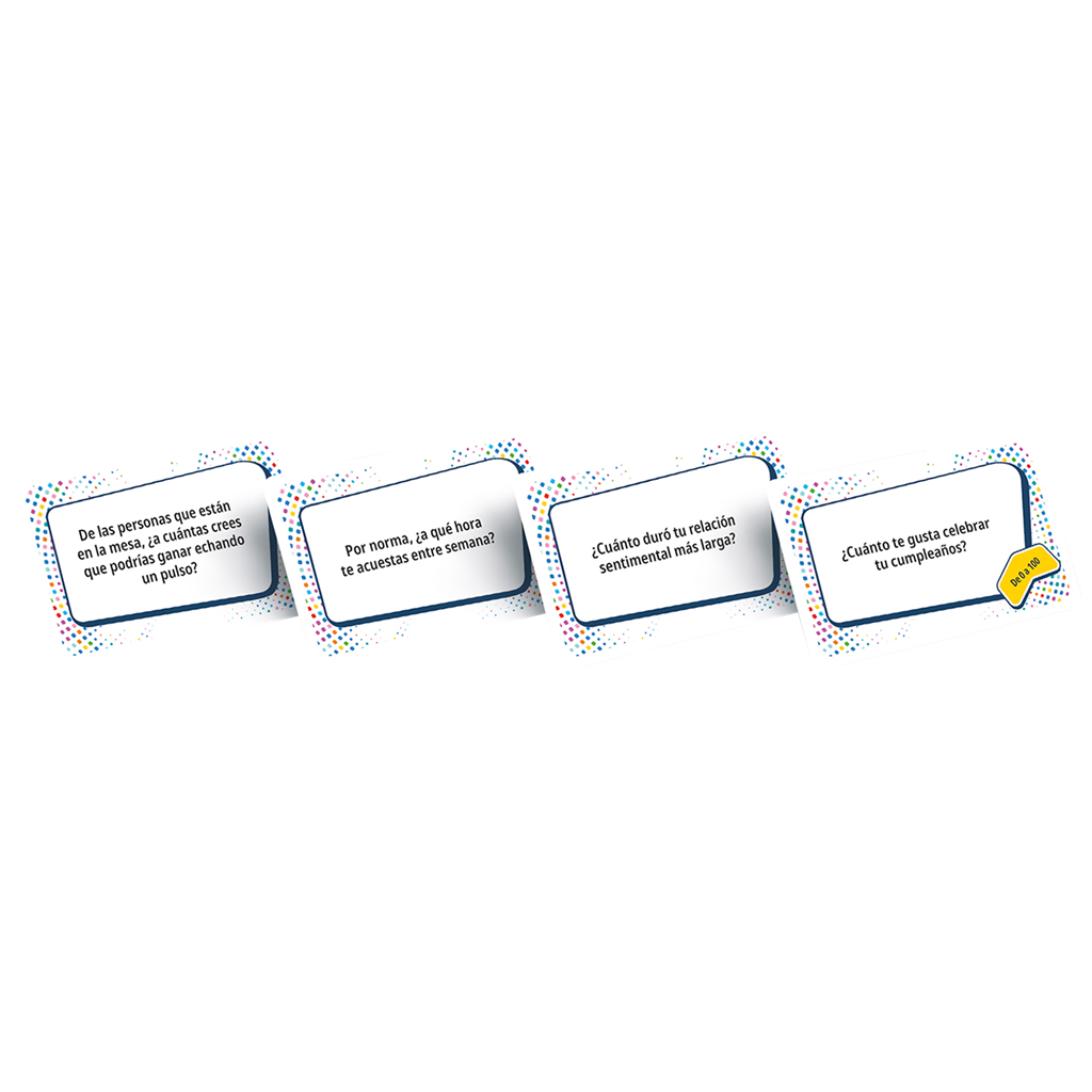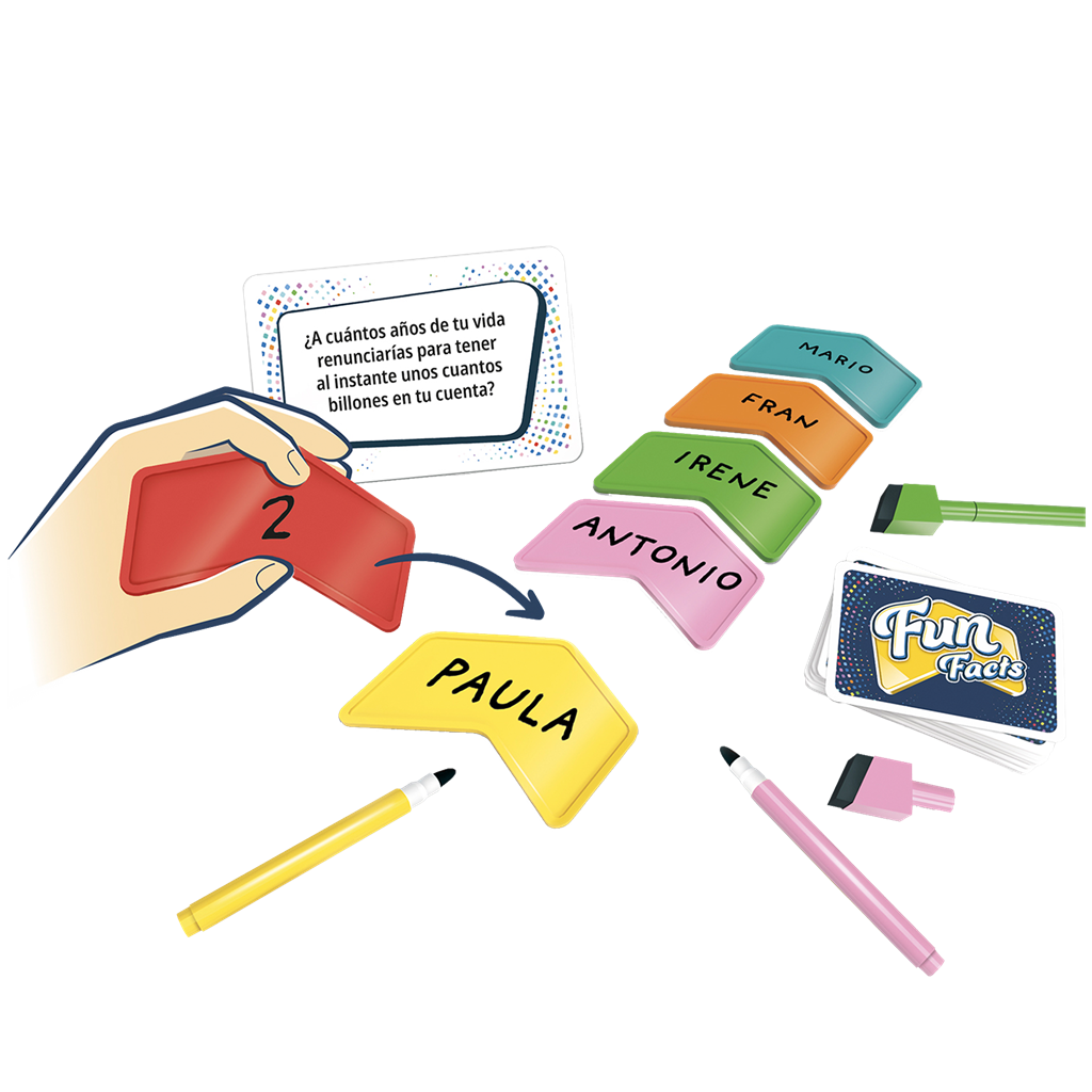 Fun Facts es un juego de fiesta cooperativo que pone a prueba lo bien que conoces a los otros jugadores. En cada turno, responderéis en secreto con un número a una pregunta personal. A continuación, intentaréis colocar vuestras respuestas en orden ascendente prediciendo cómo han respondido los demás. Por último, revelaréis las respuestas y ganaréis puntos si habéis acertado. Después de 8 preguntas, apuntad vuestra puntuación final en el registro de leyendas. ¡Intentad superar vuestra máxima puntuación en la próxima partida!