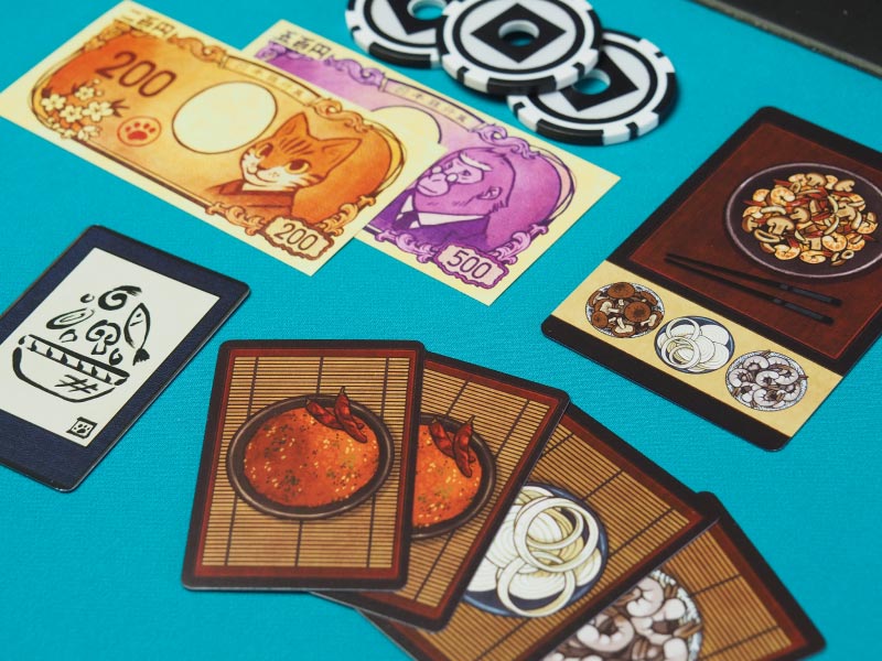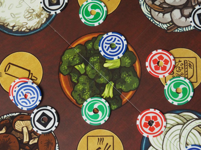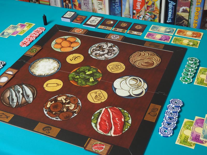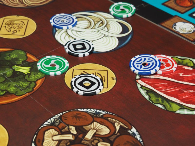 Bienvenido al concurso de cocina para chefs de hibachi. Para ser el primero en completar tres recetas, cada chef lanzará sus fichas en la zona de cocinado para comprar y vender los ingredientes que necesitan para preparar sus recetas.