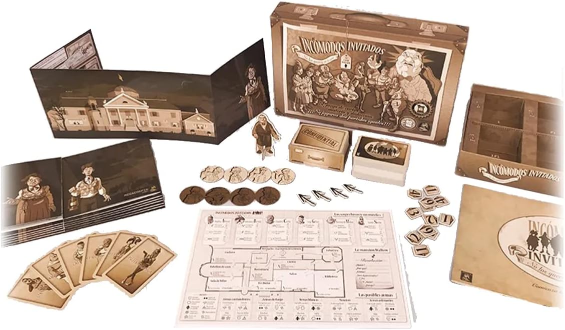 INCÓMODOS INVITADOS es un juego de cartas, misterio y deducción en el que cada partida recrea de forma diferente la noche en la que el Sr. Walton fue asesinado.