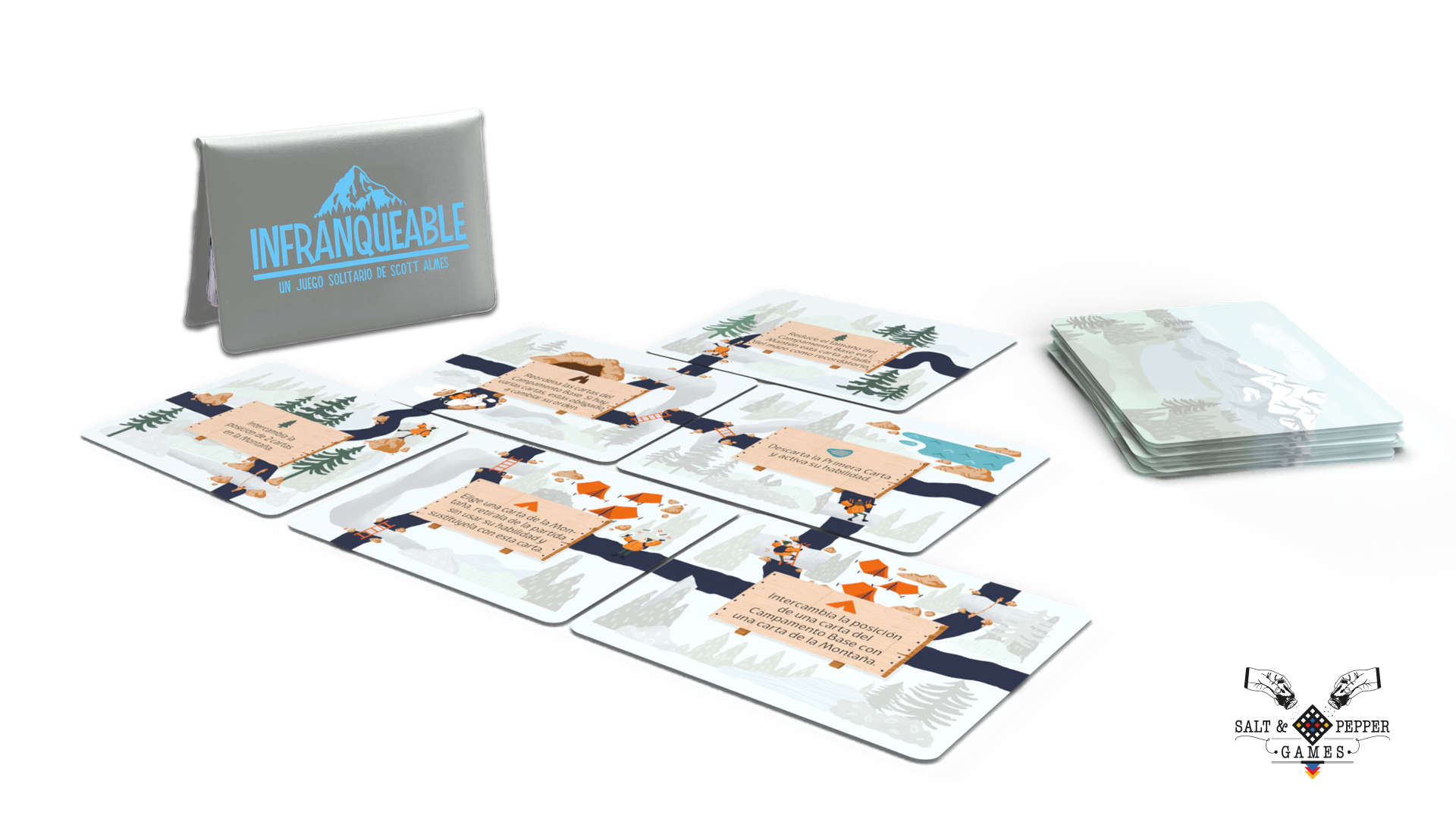 Infranqueable es un nuevo juego en solitario de Scott Almes que se une a nuestra línea «Simply solo» donde deberás coronar la cima de una montaña construyendo una ruta desde la base hasta el pico. Para conseguirlo, deberás gestionar con maestría las cartas del campamento base.