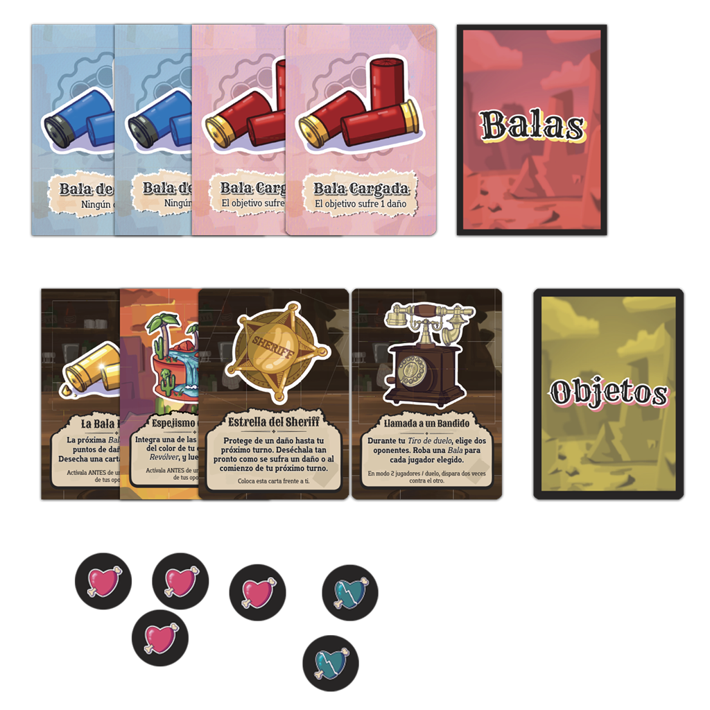 66 cartas objetos, 16 cartas balas, 1 regla del juego, 28 fichas de puntos de vida