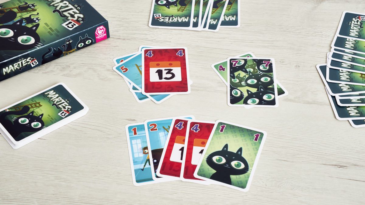 En Martes 13 trataremos de ahuyentar la mala suerte intentando coger el mínimo de cartas posibles del área central de juego. Cuantas más cartas tengamos enfrente al terminar la ronda, mayor será nuestro acumulado de puntos y más nos perjudicará. Aunque si nos hacemos con la mayoría de cartas de un determinado objeto, conseguiremos librarnos de ellas.