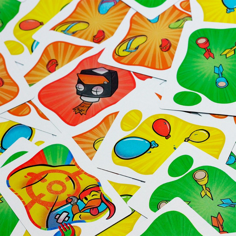 Contenido: 55 cartas (16 cartas de globo, 16 cartas de chancla, 16 cartas de dardo, 3 cartas bomba, 4 cartas de expansión), 6 patos y un reglamento.