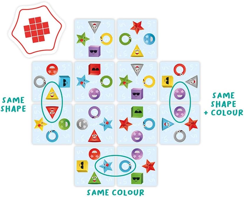 Pon a prueba tu lógica y tu capacidad de observación en éste dinámico juego en el que tendrás que conseguir ser el primero en crear la figura indicada. Para empezar a jugar dale la vuelta a la carta superior del mazo de cartas de figura. Esta será la figura que debéis crear. A continuación, todos los jugadores intentarán hacer coincidir sus cartas con la figura expuesta. ¡Cuidado! Para emparejar correctamente las cartas, las imágenes adyacentes deben ser idénticas en forma, en color o en ambas cosas, por lo tanto, siempre habrá varias maneras de crear una figura correcta. Un original juego de cartas para toda la familia en el que pondrás a prueba tu capacidad de relacionar objetos por su forma, color o ambos. El juego puede adaptarse con distintos niveles de dificultad dependiendo de la figura que tengamos que crear. Nos encantan los juegos rápidos, como los juegos de cartas, que permiten improvisar una partida en cualquier momento. Además de potenciar la velocidad de percepción y reacción, este juego nos ayuda a evaluar múltiples opciones, trabajar la memoria y resolver problemas. Incluye: 24 cartas hexagonales de figura (4 niveles de dificultad) 56 cartas de juego (4 imágenes por carta) reglas del juego. Recomendado a partir de 5 para 2-4 jugadores.