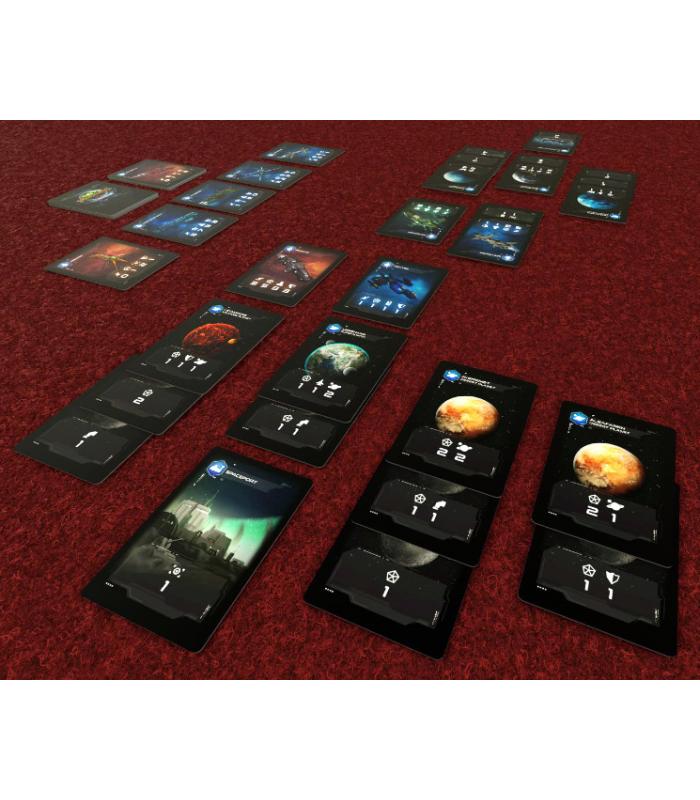 Contiene: 110 Cartas, Reglamento en inglés y en castellano, 27 Cartas de Naves, 16 Cartas de Planetas, 16 Cartas de Satélites, 12 Cartas de Personajes, 8 Cartas de Acción de Inteligencia, 18 Cartas de Acción/Reacción de Combate Espacial, 8 Cartas de Instalaciones y 5 Cartas de Razas.