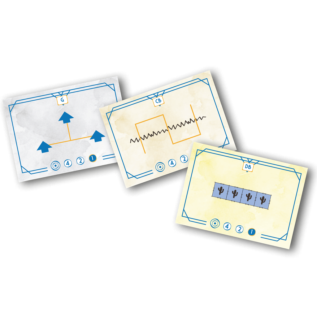 4 dados de Ruta, 2 dados de Cañón, 2 dados de Desierto, 4 tableros, 4 rotuladores, 1 reglamento, 6 cartas de Objetivo, 3 cartas de Objetivo de la Expansión Cañón, 3 cartas de Objetivo de la Expansión Desierto.