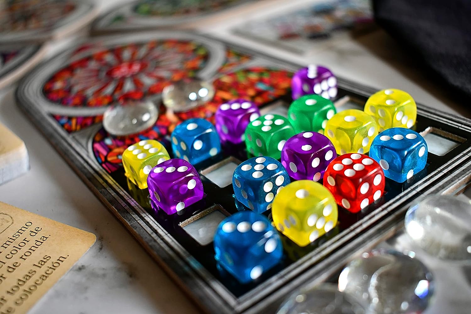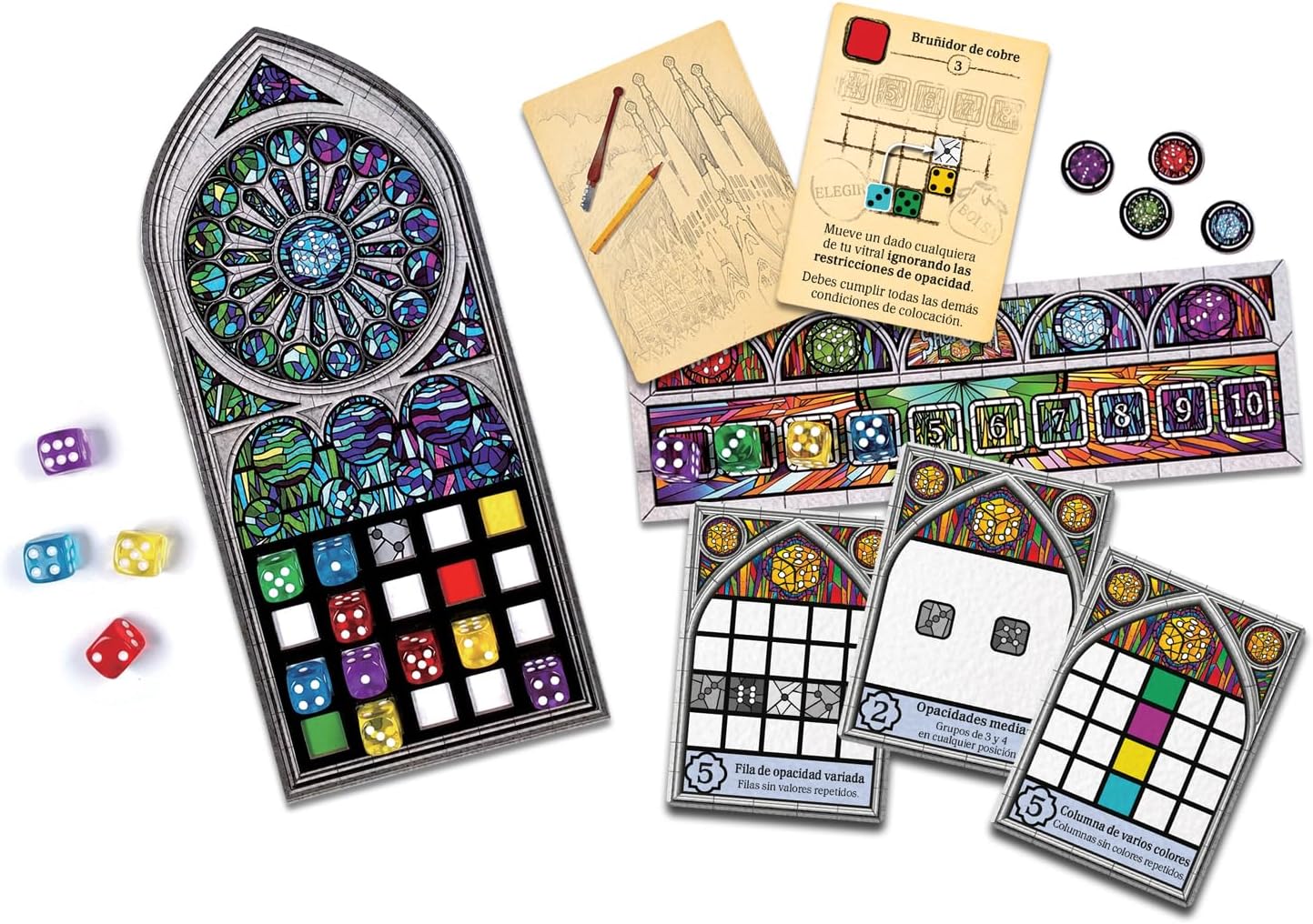 Como experto artesano, tienes en mente realizar una obra de arte con tu próxima vidriera, que será colocada en la Sagrada Familia. Los jugadores alternarán turnos escogiendo piezas de cristal, representadas mediante dados. Tendrán que escoger cuidadosamente, ya que las vidrieras tienen colores y opacidades únicas, de forma que un dado nunca podrá colocarse adyacente a otro que comparta alguna de estas características. Dispondrás de herramientas que te ayudarán a lograr completar esta importante tarea. Aumenta tu prestigio adaptando la obra a los deseos de los admiradores, pero siempre manteniendo un estilo propio mientras completas tu próxima obra maestra del vidrio. Claves de venta: 1. Inspirada en la magia de la luz de Gaudí. 2. Una vistosa combinación de mecanicas. 3. Ideal para famílias jugonas. Mecánicas: #dados #construcción de patrones #formación de grupos