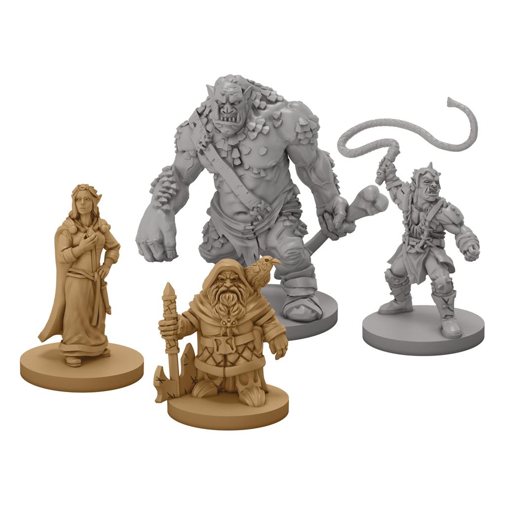 5 hojas de Héroe, 20 piezas de tablero de viaje de doble cara, 30 figuras de plástico, 42 cartas de Objeto, 3 cartas de Título, 25 cartas de Habilidad de Héroe, 60 cartas de Habilidad de Cometido, 53 fichas de juego variadas, 13 fichas de Terreno variadas, 4 cartas de Terreno y 1 Reglamento.